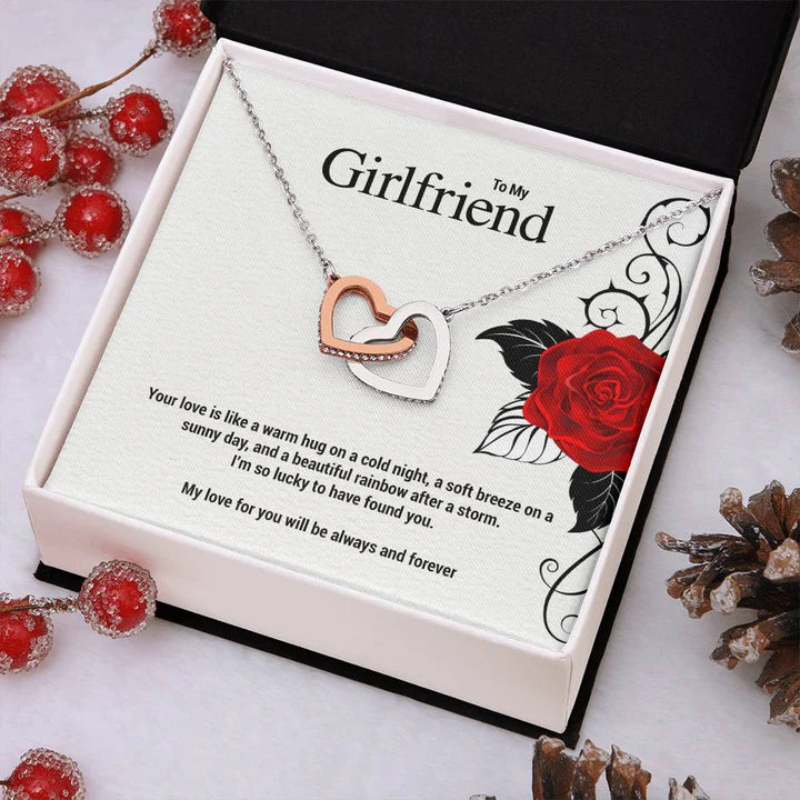 To My Girlfriend...Your love is like a warm hug on a cold night, a soft breeze on a sunny day, and a beautiful rainbow after a storm. I'm so lucky to have found you. My love for you will be always and forever.