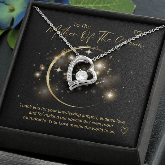 The Exquisite Forever Love Necklace is guaranteed to make The Mother Of The Groom feel truly appreciated! It boasts a magnificent 6.5mm CZ crystal at its center, encircled by a gleaming heart-shaped pendant adorned with petite crystals for added brilliance and luster. Meticulously fashioned with a choice of white gold or yellow gold finish, this timeless piece is the perfect everyday treasure.